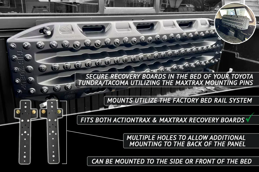 The Rago Traction Board Mounts allow you to secure your recovery boards in the bed of your Toyota Tundra or Tacoma with the MaxTrax Mounting Pins. The mounts utilize the factory bed rail system and can be mounted to the side or front of the bed. Multiple holes also allow you to mount Quick Fists to the back side of the mounting plate for storing shovels or other recovery gear. They are extremely easy to install and come with all mounting hardware. These mounts are finished in a weather resistant black powder coat.