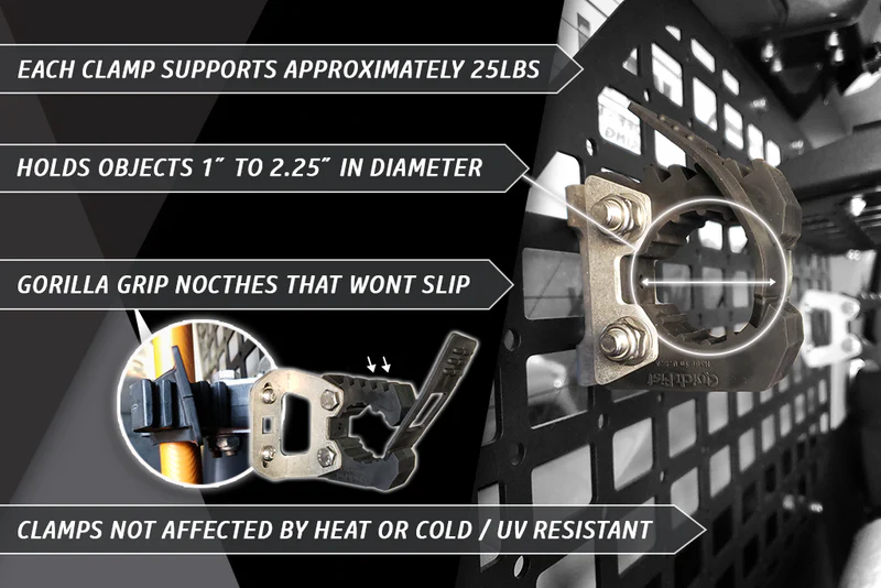 Rago Fabrication created the perfect mounting solution for the Quickfist Clamps which work with any Rago Molle Panel. With the ability to be mounted horizontally and vertically, you will add endless organization to your rig! Thoughtfully designed and fabricated with 1/8" aluminum, these mounts will not rust, leaving you worry-free no matter your climate.
